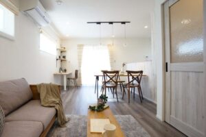 ホワイトを基調とした、ナチュラルな印象のLDK。キッチンのキャビネットはクリーム色、キッチンの袖壁と腰壁はシャビーな木目で、どこかレトロな雰囲気を漂わせています。LDKをL字型に配置することでリビングからほどよい距離を保ち、家族の気配を感じながらも、落ち着いて家事ができる空間になっています。